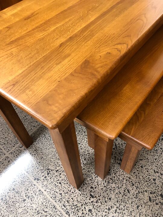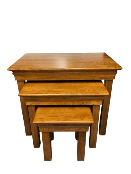 This French Rustic Solid Oak Nest of Tables is ideal for when guests pop round unexpectedly or when you just need a few extra surfaces for drinks and nibbles at a dinner party. Crafted from premium-grade solid oak by expert woodworkers, each table demonstrates all the hallmarks of this popular range; these include elegantly flared cornices, inlaid groove detailing, and softly rounded edges. Ideal in the living room, or even a day room, these tables are sure to add a sense of refined opulence and understated luxury to any room. To maintain the natural lustre and keep your hardwood furniture looking its best for years to come, apply clear Wax Polish every three to four months.