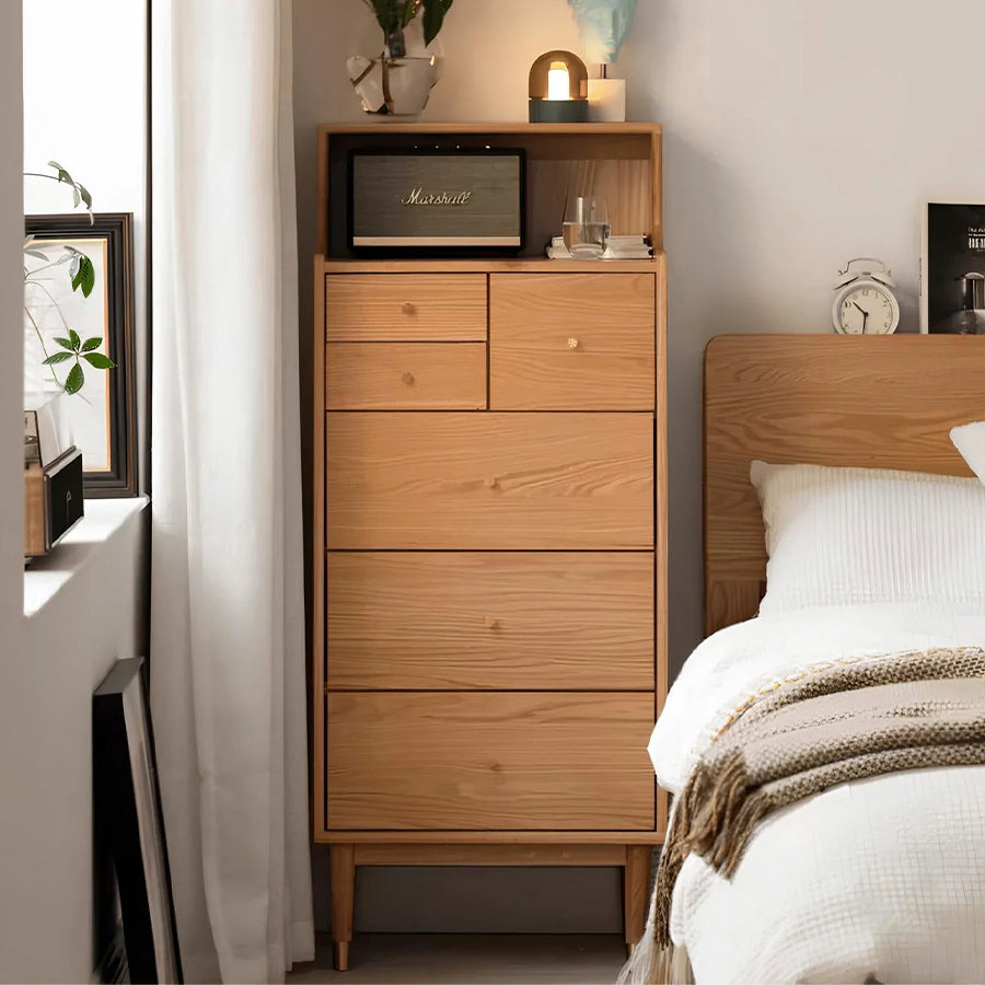 The Oslo Natural Solid Oak 3 Over 3 Tallboy streamlines your storage with six divided drawers and showcases traditional craftsmanship with dovetail joinery. It's compact and versatile for fitting into various corners, features an open display area, and combines sophistication with modern style through brass handles and legs. With solid wood slides, it guarantees lasting durability, making it a practical and contemporary addition to your space, perfect for efficient storage and a touch of style.