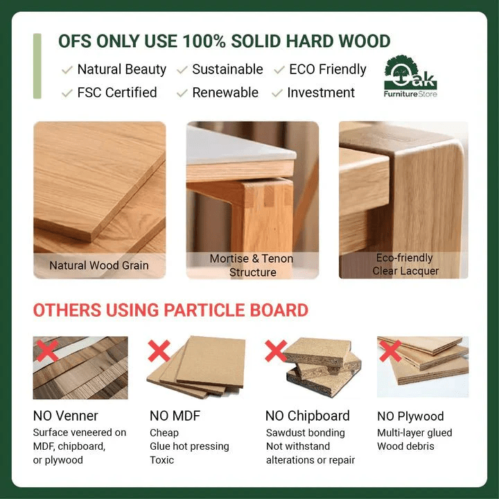 At OFS, only 100% premium-grade solid timber is used on all our furniture products, we never use any particle board such as Veneer, MDF, Chipboard or Plywood on any parts. |
